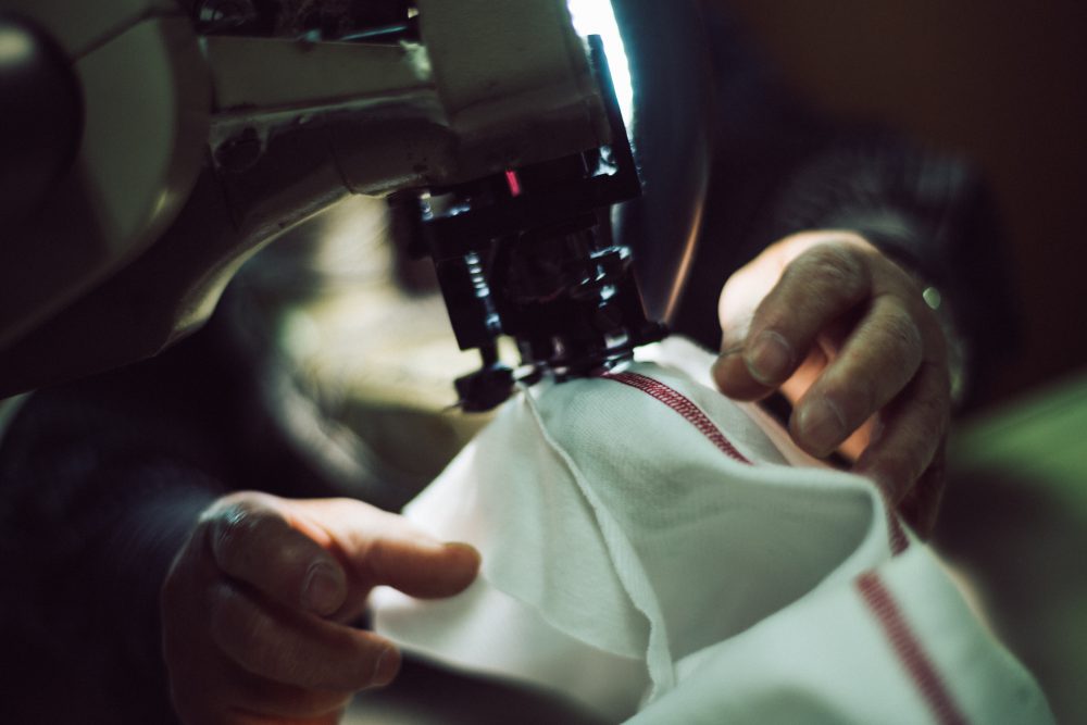 ヴィンテージミシンを駆使し吊編機を有するニッター様との別注生地開発・ハンドルミシンの刺繍・古い手法でのフロッキープリント等での作り込みを行い