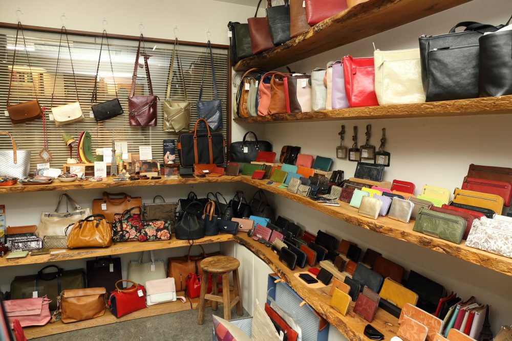 移転を期に、カバンの販売と修理受付を行う小売店舗を新設。1坪ほどの店内には、オリジナルブランド「スクイーズ」のカバンや財布が所狭しと置かれている。