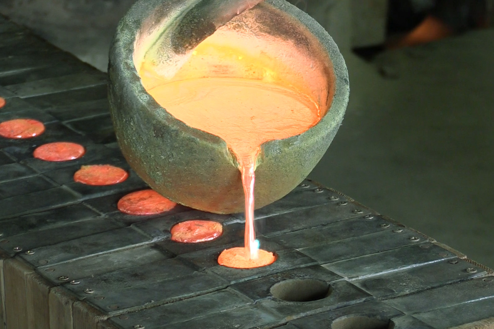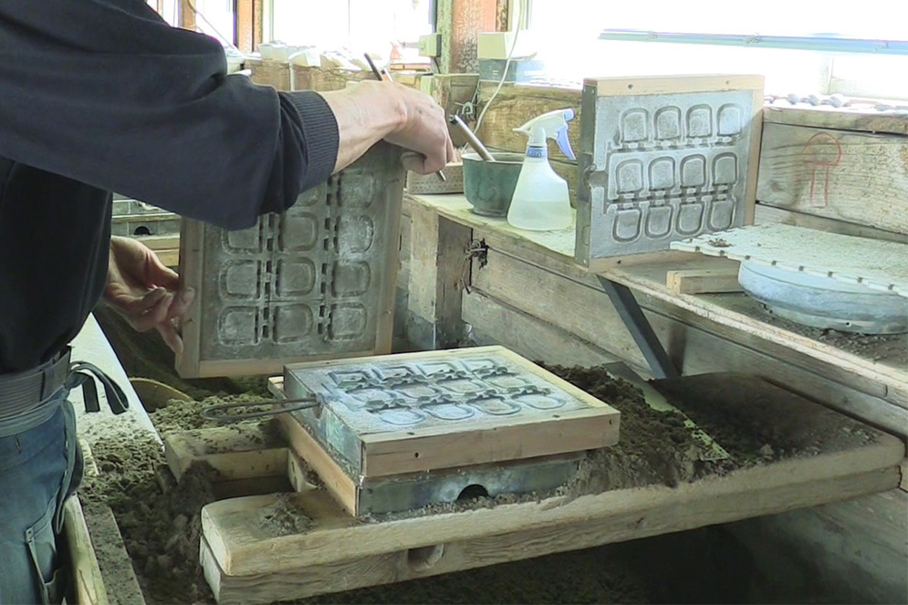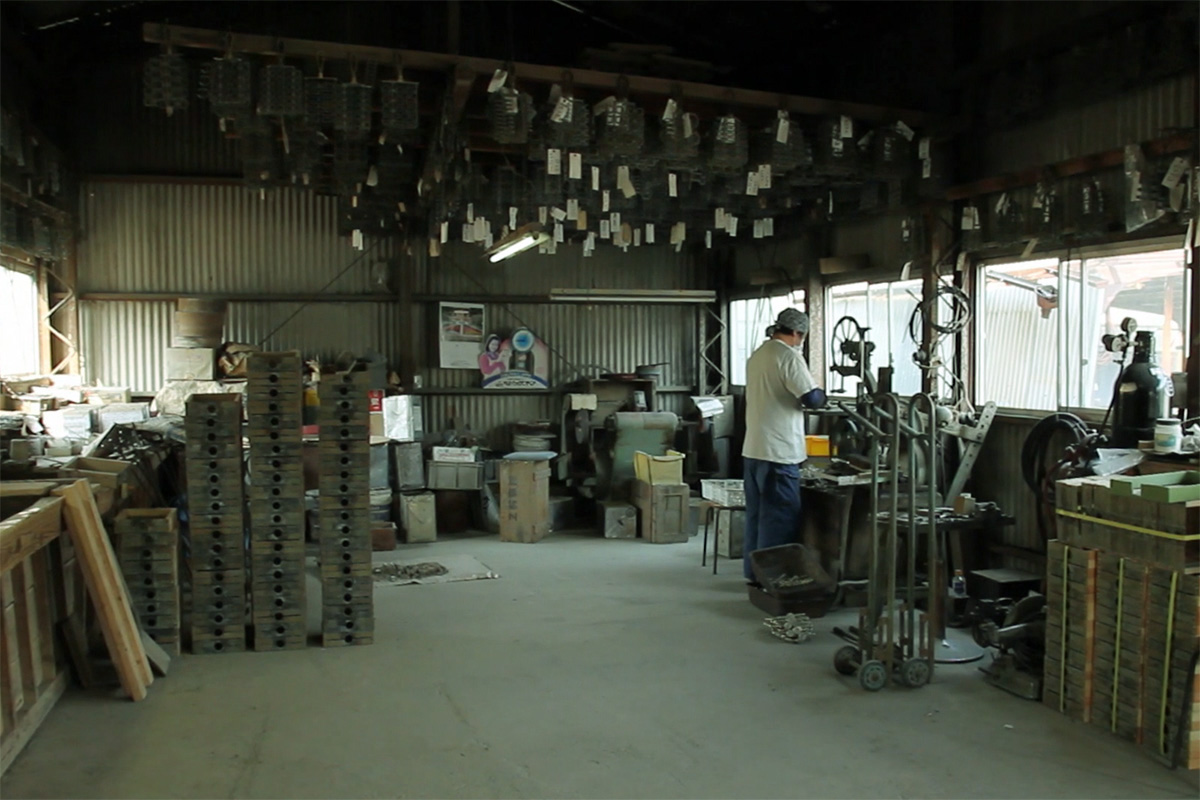 同工場では、昔ながらの砂型鋳造製法を実施している。木枠の中に砂を埋め込んで砂型を作り、そこに熱して溶かした金属を流し込んで成型する製法だ。すべての工程に人の手が必要で、別府鋳工に在籍するベテラン職人たちの腕前が物を言う。