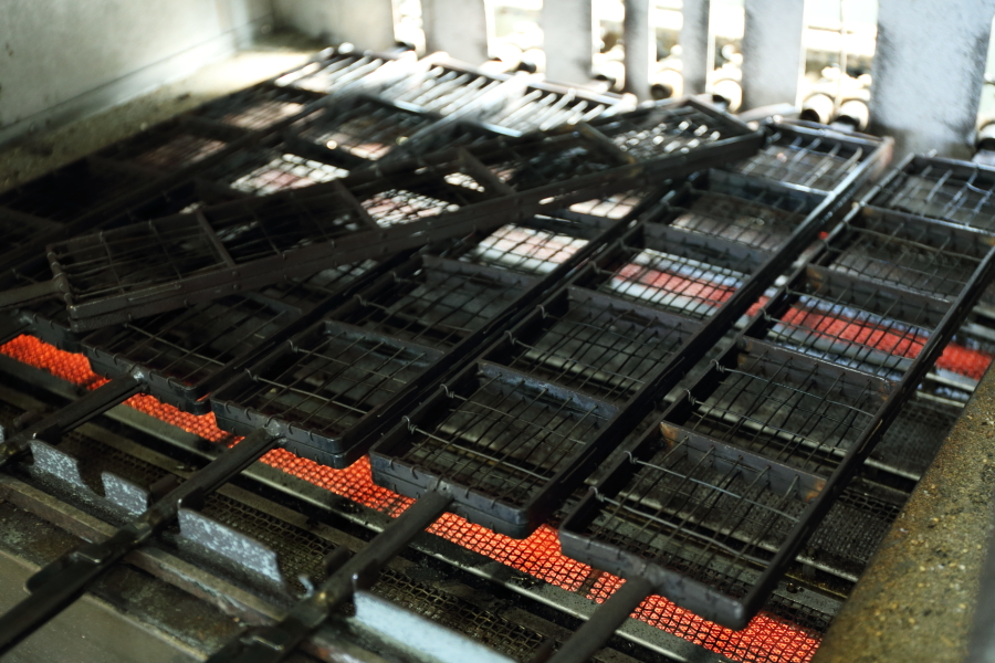 看板商品の煎餅は、埼玉北部と青森、2カ所から厳選して仕入れたうるち米ベースの生地を採用。ベルトコンベアは使わず、昔ながらの製法を駆使して網の上で何度もひっくり返しながら焼き上げていく。味付けも昔ながらの手作業で行う。