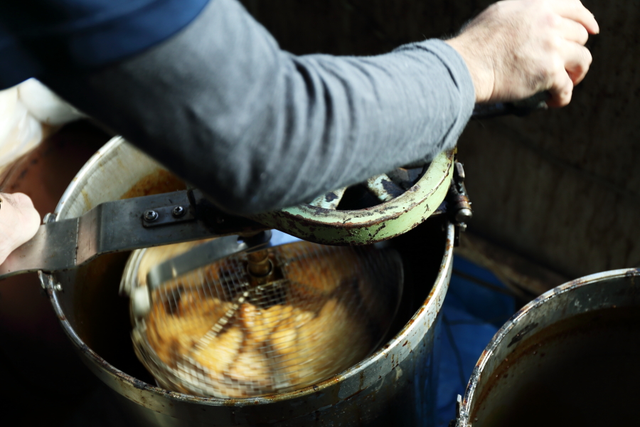 揚げ餅は自社内で餅つきをし切った後、空の様子をうかがいながら必ず屋上で天日干しを行う。一般に使われているフライヤーではなく、昔ながらの中華鍋を使って揚げている。そのほうが生地と対話しながら作業が出来、理想的な状態で揚げられるのだという。