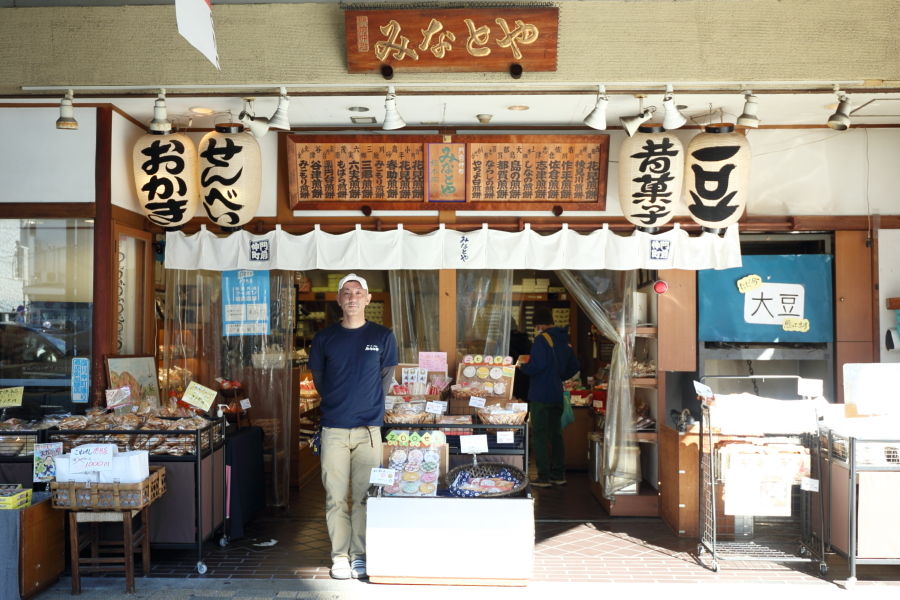 多くの店舗が軒を連ねる深川仲町通り商店街。その一角にあるみなとやは、1948年から続く老舗の煎餅屋だ。
