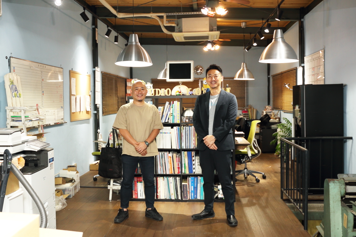 数多くの中小企業がひしめく東京・三筋に本社を構えるのが、スタジオケイだ。細い階段を登った3階部分に打ち合わせスペースやデスクがあり、代表を継いだ二代目の大友佑介さんと営業を担当している小澤麦さんが出迎えてくれた。周りには同社で製造された販促品のサンプルが所狭しと置かれている。