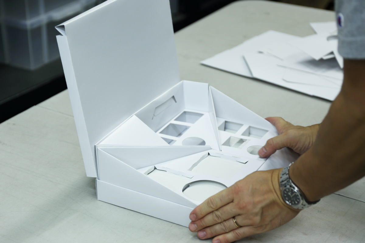 大友「私のほうで3DのCADによる設計イメージ図を作り、社内にある専用工作機を使ってホワイトダミーをお見せして、微調整を繰り返した後に印刷工場と調整し……実力のあるデザイナーや印刷屋との関係も深く、品質の高い製品を最短の納品期間でお届けしています。この業界は時間が勝負なことも多く、専門分野に特化した企業だとこのスピード感は出せないのではないかと思います」